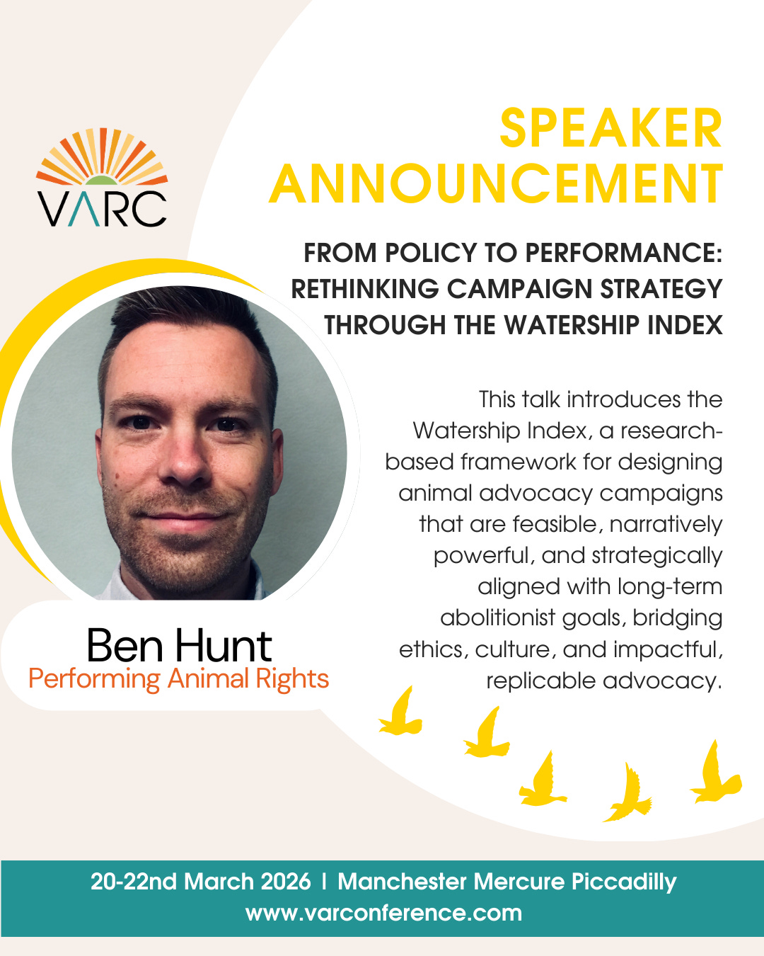 I’ll be speaking at VARC: Vegan Animal Rights Conference in Manchester, March, sharing new work on campaign strategy, narrative potency, and movement design. My talk, From Policy to Performance: Rethinking Campaign Strategy through the Watership Index, will introduce a tool I’ve been developing to help campaigns align abolitionist ethics with strategic feasibility.